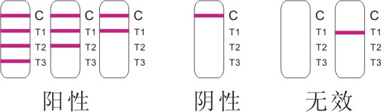 陽(yáng)性:若有四條紫紅色條帶出現(xiàn)。三條分別位于檢測(cè)區(qū)(T1)、(T2 )和(T3)內(nèi),另一條位于控制區(qū)(C)。結(jié)果表明:樣本中含有以上三種心肌標(biāo)志物。