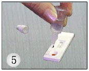 在加入血液后2秒鐘后,加入1滴緩沖液,防止血液凝固。血樣和緩沖液加入后即可看到擴(kuò)散反應(yīng),會(huì)慢慢流過觀察區(qū)。 一般5分鐘后,混合液已流入觀察區(qū)(檢測區(qū)和對(duì)照區(qū))。流動(dòng)中的紅暈是正常現(xiàn)象。(圖5)