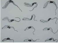 克氏錐蟲是于1909年由巴西人Chagas在患兒血內(nèi)發(fā)現(xiàn)的一種原蟲。其生活史中有錐鞭毛體與無鞭毛體兩種形態(tài)。在哺乳動物血液內(nèi)為錐鞭毛體,長20μm,體形呈C字或鐮刀形,具有與蟲體等長的波動膜和自由擺動的鞭毛,核居中央,動基質(zhì)明顯,位于核的后端。