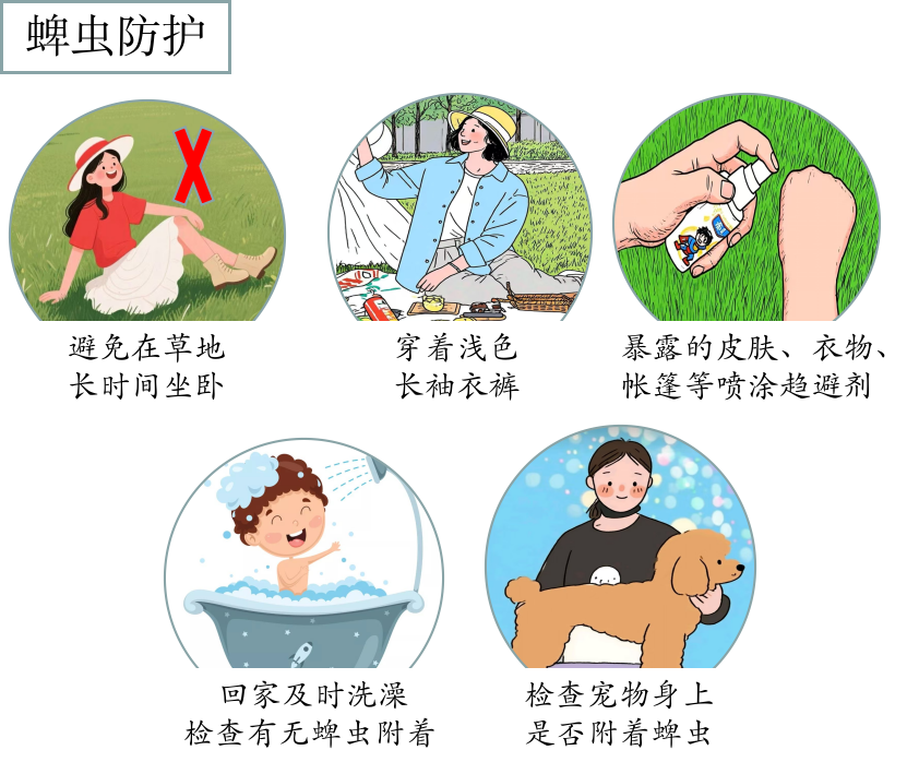事前預(yù)防:穿著緊口、淺色、光滑的長袖衣褲,不穿涼鞋,減少皮膚暴露;避免在草叢深處久坐;使用含避蚊胺、氯菊酯等成分的驅(qū)蟲劑噴灑腳踝、腰部等部位以及衣服和帳篷等露營裝備。