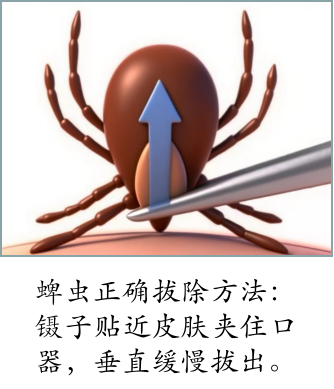 應(yīng)急處理:發(fā)現(xiàn)蜱蟲切勿硬拔!可先將酒精或風(fēng)油精滴在蜱蟲頭部,然后用尖頭鑷子貼近皮膚夾住蜱蟲口器,垂直緩慢拔出;用碘伏消毒傷口,保存蜱蟲尸體供疾控部門檢測;若出現(xiàn)發(fā)熱、皮疹等癥狀,立即就醫(yī)并告知蜱蟲叮咬史。