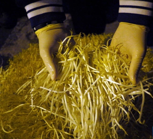 據(jù)嫌犯楊某隆和潘某棉等人交待,沒(méi)有添加劑的豆芽往往要10多天才會(huì)長(zhǎng)成,且細(xì)和短,容易出根,味道有些苦,培育成本高,成活率低。兩團(tuán)伙用石灰粉兌水代替消毒水,添加無(wú)根劑、A B粉,用頭孢(抗生素)等添加劑催產(chǎn)。這樣豆芽生產(chǎn)周期只要6天,且顏色白凈,水分豐富,形態(tài)美觀,不易生根,比較壯,沒(méi)黑點(diǎn),能夠保持亮度,比較甜。